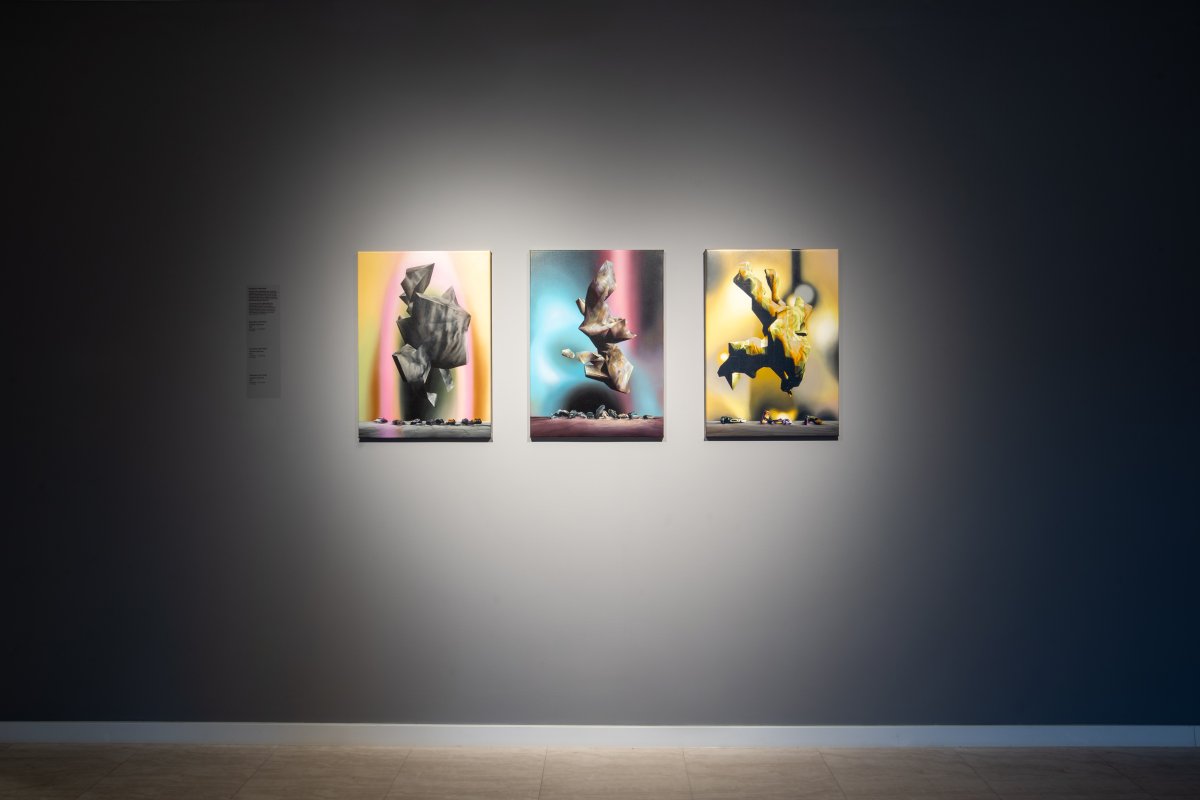 Les fonds naviguent entre une composition abstraite et la représentation du mur de l’atelier protégé par des plastiques recyclés (tons gris-vert) où les traces des peintures précédentes se sont superposées. Les débordements du cadre, l’épuration du pinceau ou les réglages de l’aérographe suggèrent une certaine géométrie induite par les contours de ces travaux passés et tendent ainsi à une forme de perspective dont le lieu serait la peinture. Ces peintures fantômes dans la peinture confondent le temps et par contraste cette sensation est accentuée par les modèles flottants, en suspension, dont les volumes réalistes sont renforcés par des dégradés fins de lignes colorées.